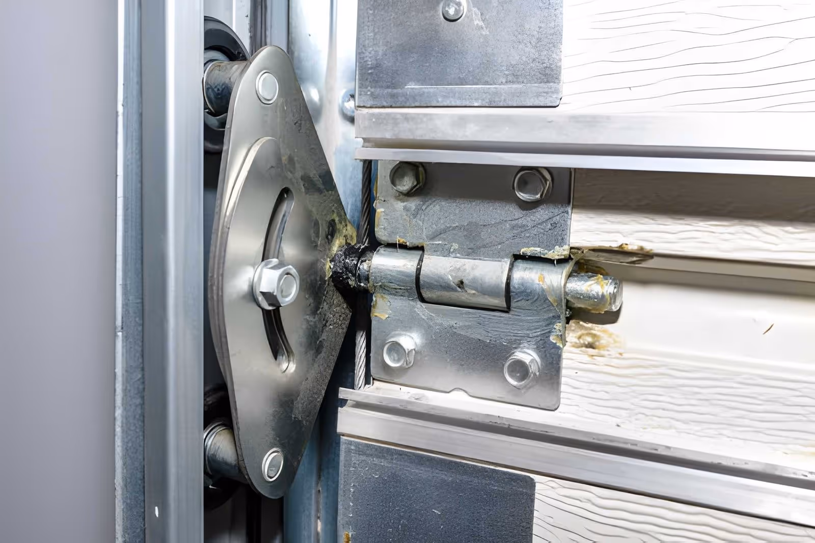 Corroded or Damaged Hinges, Brackets & Hardware lose their strength and rigidity. Corrosion eats through metal thickness, reducing load-bearing capacity. Damaged hardware can cause your door to hang unevenly or operate unsafely. Brackets may crack or bend under stress, compromising the entire system's stability.
